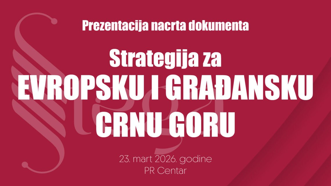 Organizacija STEGA – održaće u ponedjeljak, 23. marta 2026. godine, sa početkom u 11:00 časova u PR Centru u Podgorici, prezentaciju nacrta dokumenta “Strategija za evropsku i građansku Crnu Goru”.